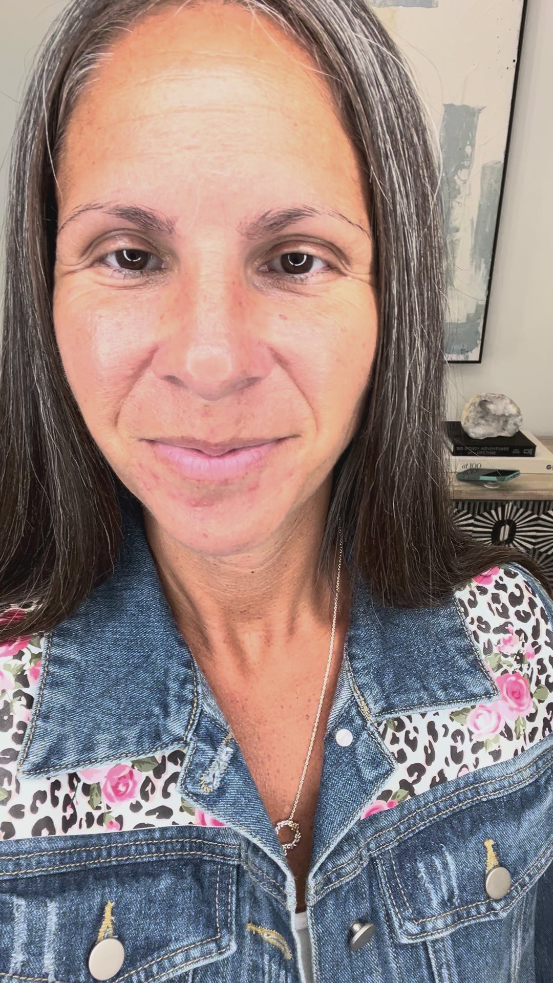 Details - Animal and floral print on shoulders, dark wash, distressing, functioning front buttons, chest pockets, true denim material