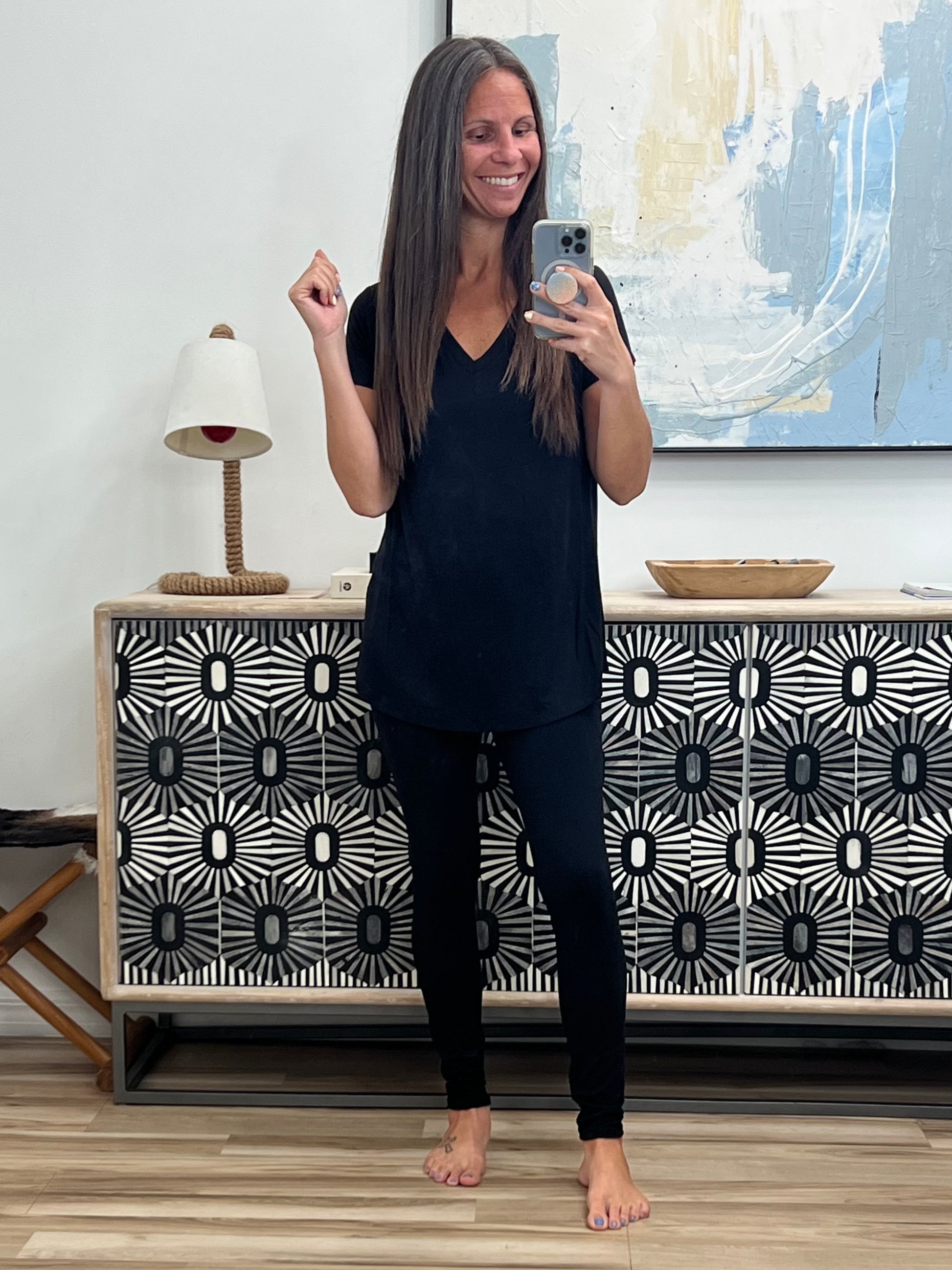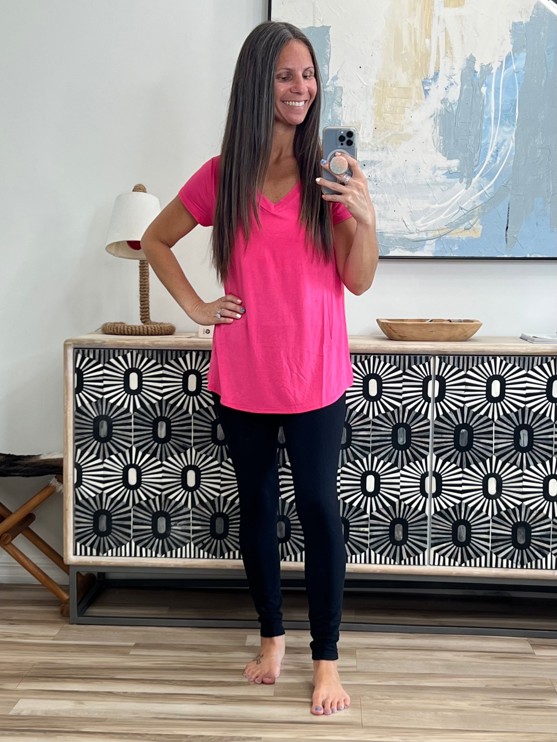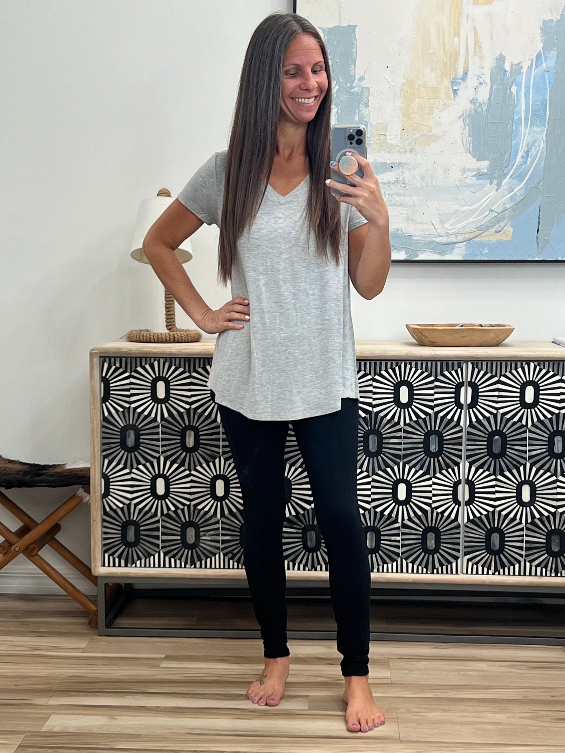 Details - Stretchy, soft, v-neck, slight scoop hem, full coverage for leggings