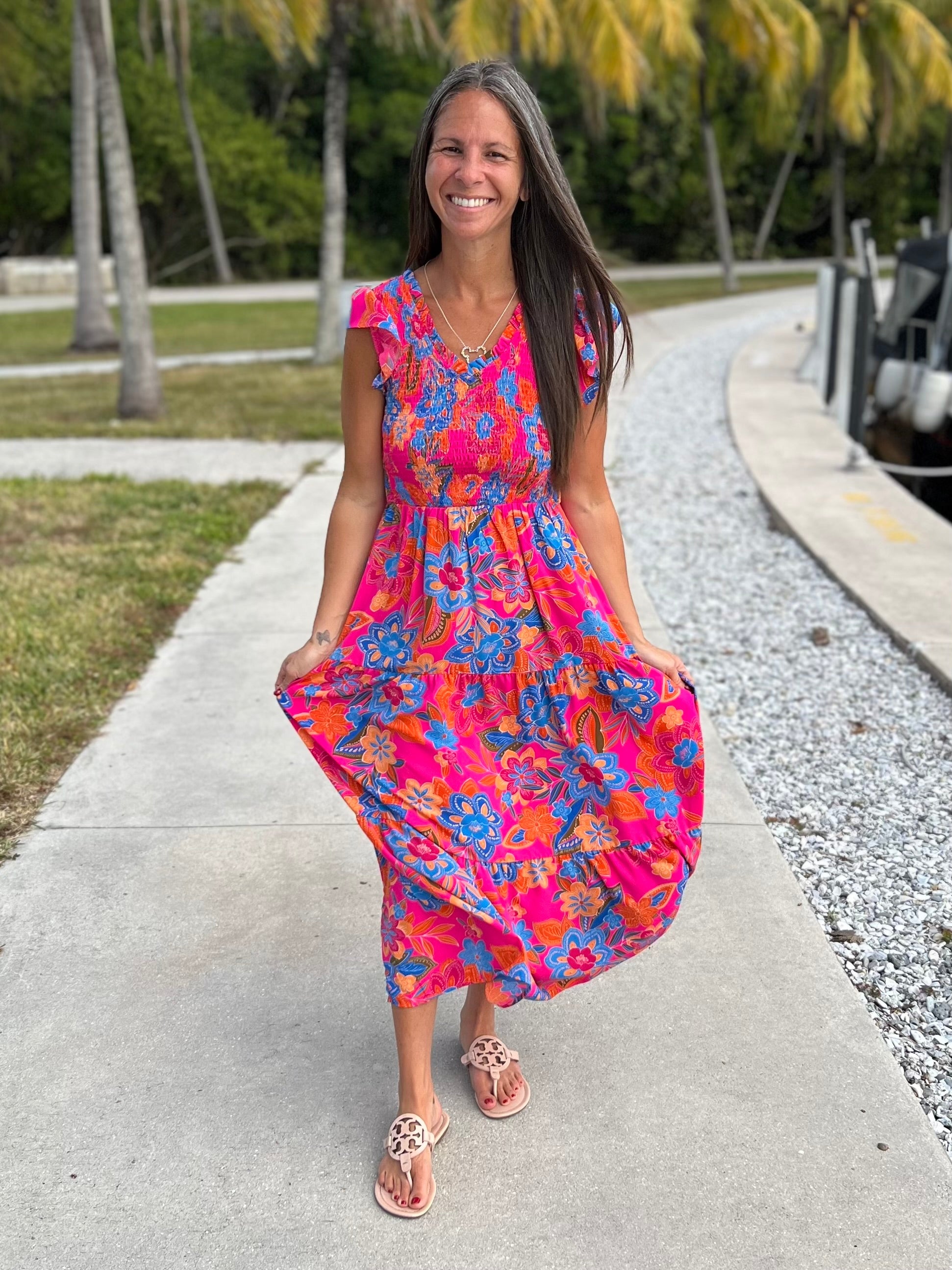 Printed V-Neck Cap Sleeve Pocketed Midi Dress